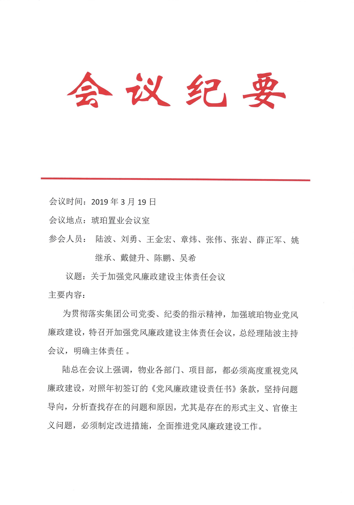 琥珀物業(yè)于2019年初,針對公司黨風(fēng)廉政建設(shè)主體責(zé)任落實召開專題會議,按照集團公司下發(fā)的黨風(fēng)廉政責(zé)任書的部署和要求組織、分解黨風(fēng)廉政建設(shè)任務(wù),貫徹落實“三重一大”事項集體決策制度。