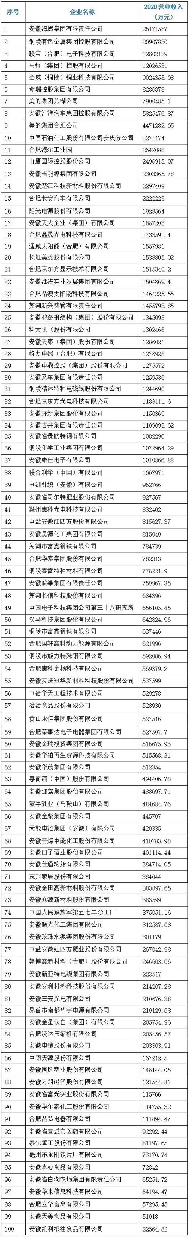 2021安徽省制造業(yè)百強企業(yè)榜單