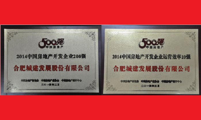 合肥城建喜獲“2014中國房地產(chǎn)開發(fā)企業(yè)200強”、“中國房地產(chǎn)開發(fā)企業(yè)運營效率10強”