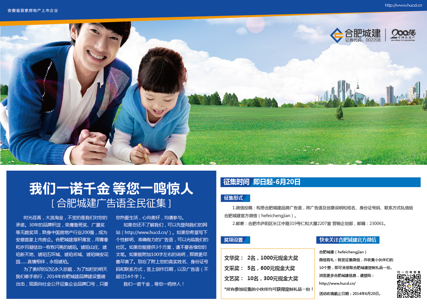 合肥城建發(fā)展股份有限公司是國家一級資質(zhì)和AAA級信用等級的房地產(chǎn)開發(fā)企業(yè),安徽省首家房地產(chǎn)上市企業(yè)(證券代碼:002208)。 根據(jù)業(yè)務(wù)發(fā)展需要,擬面向社會、高校公開招聘下列工作人員,招聘詳情見附件。 合肥城建2014年人才招聘公告.doc